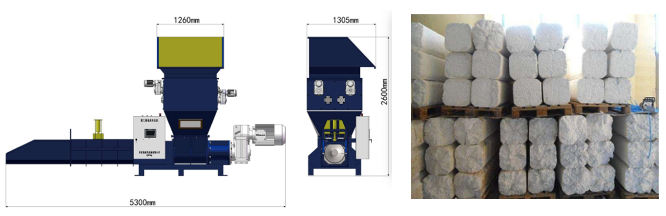 秦風(fēng)機械的EPS泡沫冷壓機就是用來解決這個問題的,它可以減少EPS泡沫塑料材料的大小,壓縮比可以達到1:30-1: 50。壓縮的成品是EPS泡沫塑料塊,其密度可達300kg/m3,很容易把EPS泡沫塑料材料處理成另一種回收處理形態(tài)。