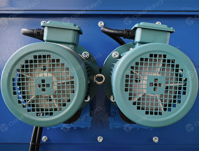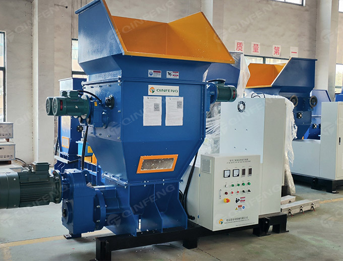 CF-NHM400型號(hào)的熱熔機(jī)采用四軸破碎刀片、雙排平行的刀片軸對(duì)稱地固定在刀片上,刀片在雙軸刀片軸上錯(cuò)位排列,各軸上的刀片通過(guò)計(jì)算的方法均勻地布置在同一方向。每一軸上的第一個(gè)刀片和最后一個(gè)刀片都成90度角。當(dāng)雙軸破碎刀片開始工作時(shí),兩個(gè)平行的刀片軸以不同的旋轉(zhuǎn)方向進(jìn)行旋轉(zhuǎn),形成一個(gè)波浪的控制,這樣材料就可以恒定的速度向下移動(dòng),在經(jīng)過(guò)切割刀片的切割后,會(huì)變成更小的塊狀。EPS熱熔機(jī)里的四軸破碎刀片可以把EPS料變成更小體積的塊,然后通過(guò)濾網(wǎng)。這些不能通過(guò)濾網(wǎng)再次被破碎的料會(huì)最終通過(guò)濾網(wǎng)過(guò)濾掉。該材料將由高速旋轉(zhuǎn)螺桿推送到加熱筒。主機(jī)的螺桿可以輸送、加熱料,使其達(dá)到熱熔狀態(tài),然后擠出并通過(guò)模具冷卻得到規(guī)則型的方塊,更加便于貯存和運(yùn)輸。